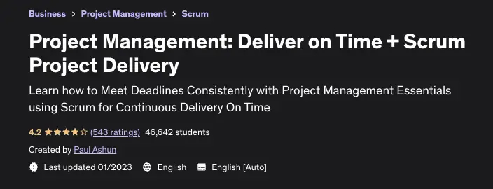 | #8. Project Management: Deliver on Time + Scrum Project Delivery | Paul Ashun | Regular price is $84.99 | ❤️❤️❤️46,639 enrollments (as of Feb 2023) | ⭐⭐⭐⭐4.3 (540 reviews as of Feb 2023) | ⌛1 hour |