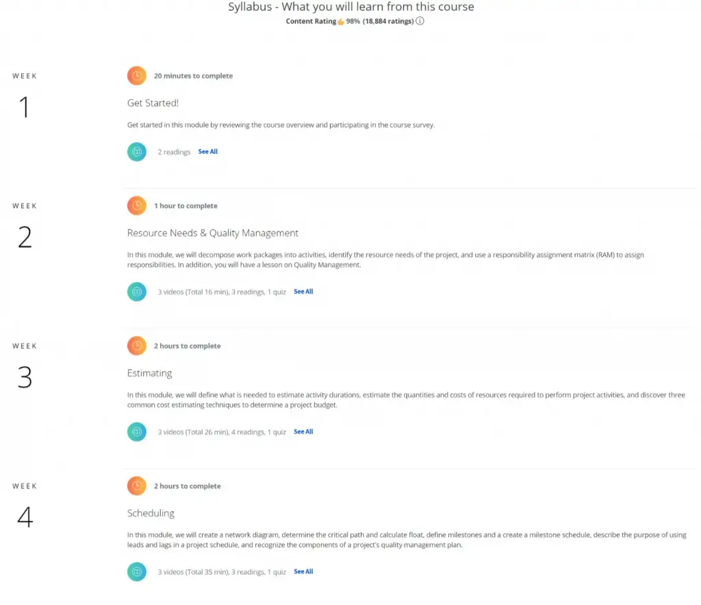| #4. Budgeting and Scheduling Projects | Maxim Sytch | Free ($149 for verified certificate) | ❤️❤️❤️❤️❤️153,806 enrollments (as of Feb 2023) | ⭐⭐⭐⭐⭐4.8 (5,789 reviews as of Feb 2023) | ⌛⌛6 hours |