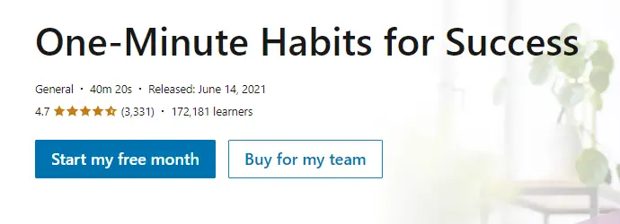 | #2. One-Minute Habits for Success | Scott Mautz | Subscription cost is $39.99 for a verified certificate | ❤️❤️❤️❤️❤️172,181 enrollments (as of Feb 2023) | ⭐⭐⭐⭐⭐4.7 (3,331 reviews as of Feb 2023) | ⌛ 40m 20s |
