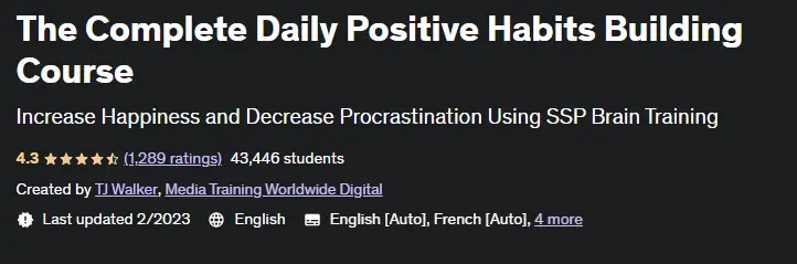 | #5. The Complete Daily Positive Habits Building Course | TJ Walker and Media Training Worldwide Digital | $84.99 | ❤️❤️❤️43,446 enrollments (as of Feb 2023) | ⭐⭐⭐⭐4.3 (1,289 reviews as of Feb 2023) | ⌛⌛ 6h 12m |